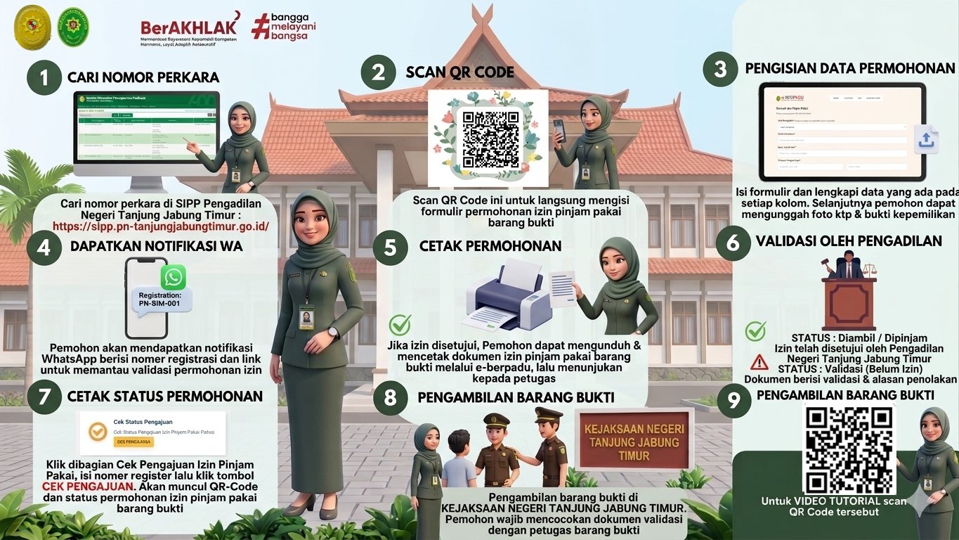 Sebagai bentuk transformasi digital, Mahkamah Agung telah menghadirkan kemudahan dalam prosedur Permohonan Izin Pinjam Pakai Barang Bukti, sehingga sobat peradilan yang memerlukan izin pada PN Tanjung Jabung Timur bisa mendaftar melalui aplikasi e-Berpadu.